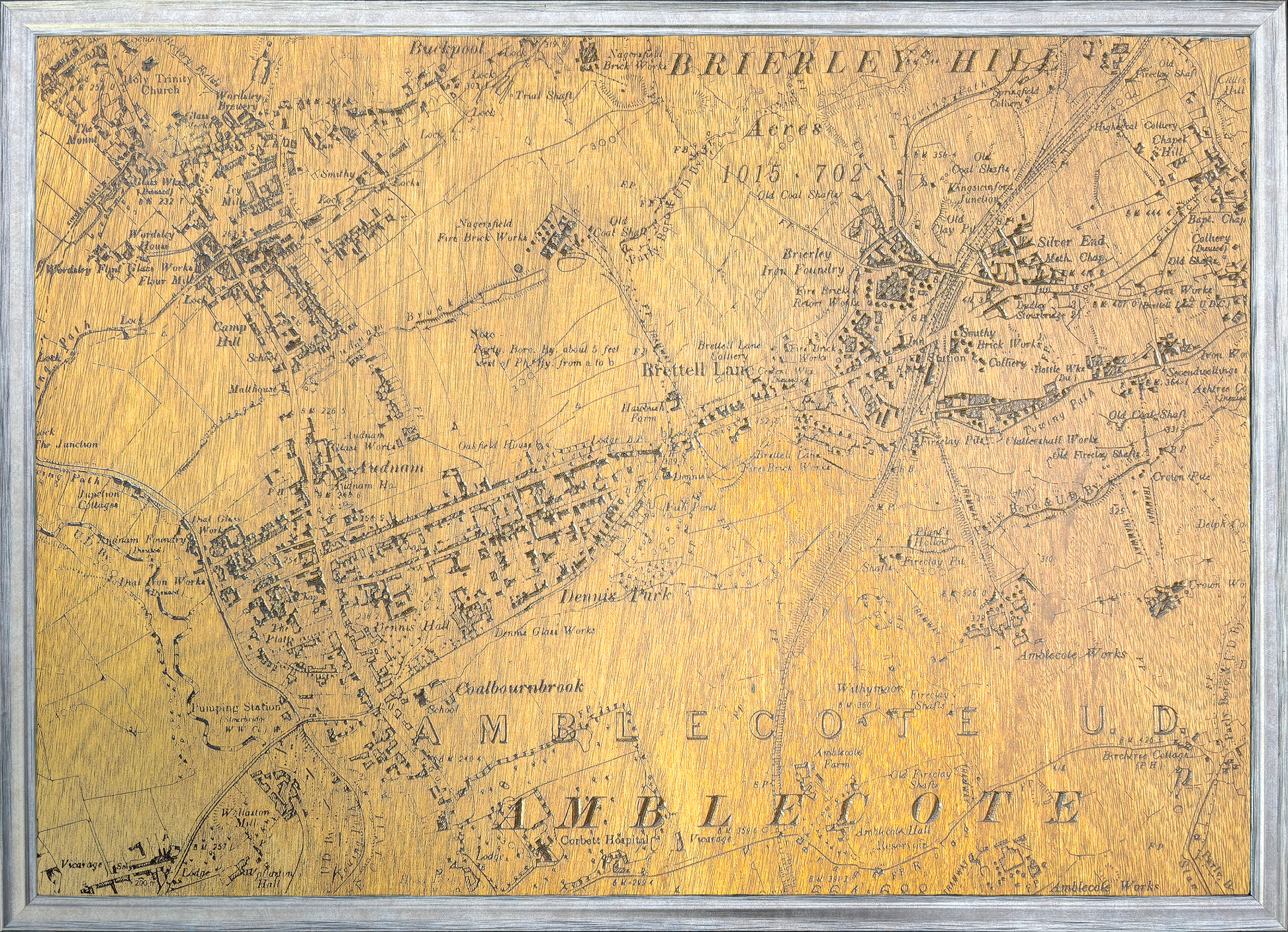 This is a carved wooden map of Amblecote Street as it was in 1892. The design is created from curated historical cartographic sources, which have been edited for clarity and aesthetic balance before carving.